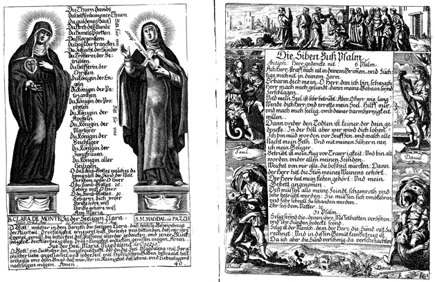 Description: On the left page: Saints Clare of Montefalco and Mary Magdalene of Pazzis stand on plinths on either side of the text. Saint Clare stands with one hand to her heart, which contains the cross that Christ planted within it in a vision. With her other hand, she extends three nail-heads, which were found within her heart after her death. On the right, Saint Mary Magdalene of Pazzis holds a hand to her heart, which sends forth a beam of light containing the words, "amor, amor, amor." The phrase is part of larger records of her ecstatic visions. On the right page: A border of images frames the text. Beginning at the top, clockwise: David is anointed, David plays his harp, David wrestles a bear, David contends with a lion, and Saul is restrained..