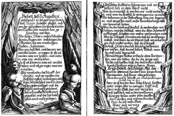 Description: An ornamental design borders a prayer of Augustine on the left page. On the top center, a laurel wreath is flanked by two bundles of swords, trumpets, flags, and curtains. At the bottom of the page, two shirtless men occupy the corners surrounded by an array of swords, bows, arrows, and shields. The text on the right page is flanked by two large palm fronds wrapped in an unfurled ribbon decorated with ecumenical German words.