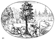 Description: An angel walks away from a tree as two dogs fight each other. This image honors St. Peter Canisius (1521 – 1597), a renowned Dutch Jesuit priest.