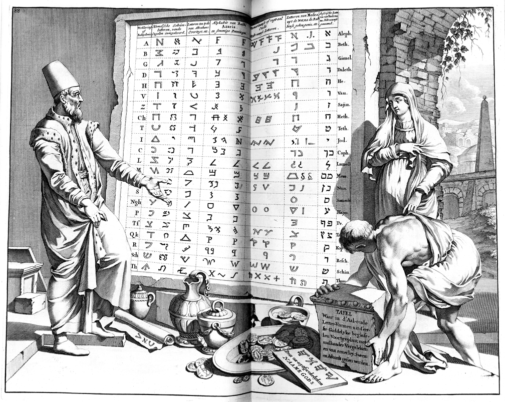 Description: A table comparing ancient Near Eastern alphabets and depicting how they arose from divine principles.
