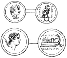 Description: A coin depicting Achaeus, a general and king of the Seleucid Empire (top) and a coin depicting Seleucus IV Philopator, king of the Seleucid Empire (bottom).