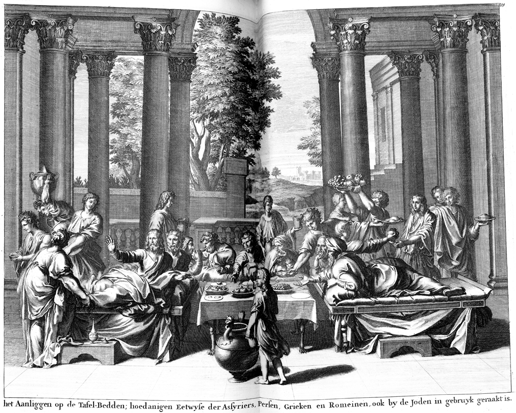 Description: This portrayal of a meal shows how Assyrians, Persians, Greeks, Romans, and Jews eat lying on beds.