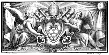 Description: This headpiece features two angels flanking the coat of arms of Pope Innocent XI (r. 1676 – 1689), which contains a shield depicting an eagle above a lion passant and six cups.