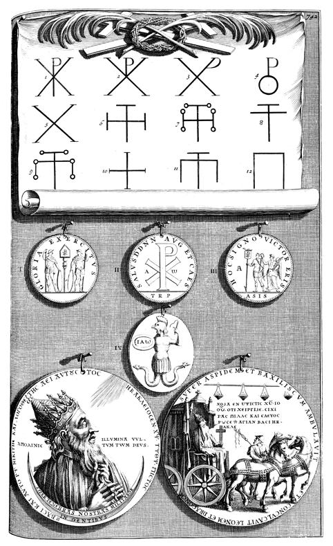 Description: Several instances where the cross is used as a symbol, in various letters and representations on coins and medals.