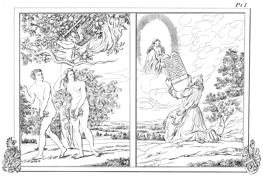 Description: The image has two leaves. On the left, Adam and Eve hold fig leaves over themselves. Above them in the tree, the serpent flees a pursuing angel with a sword. Adam and Eve look to the right, to the giving of the Law. On the right, Moses kneels before God, who extends the ten commandments from the sky. Original image by Niklaus Manuel Deutsch (1484-1530), copied by Guillaume Stettler and lithographed by Wilhelm Stettler.