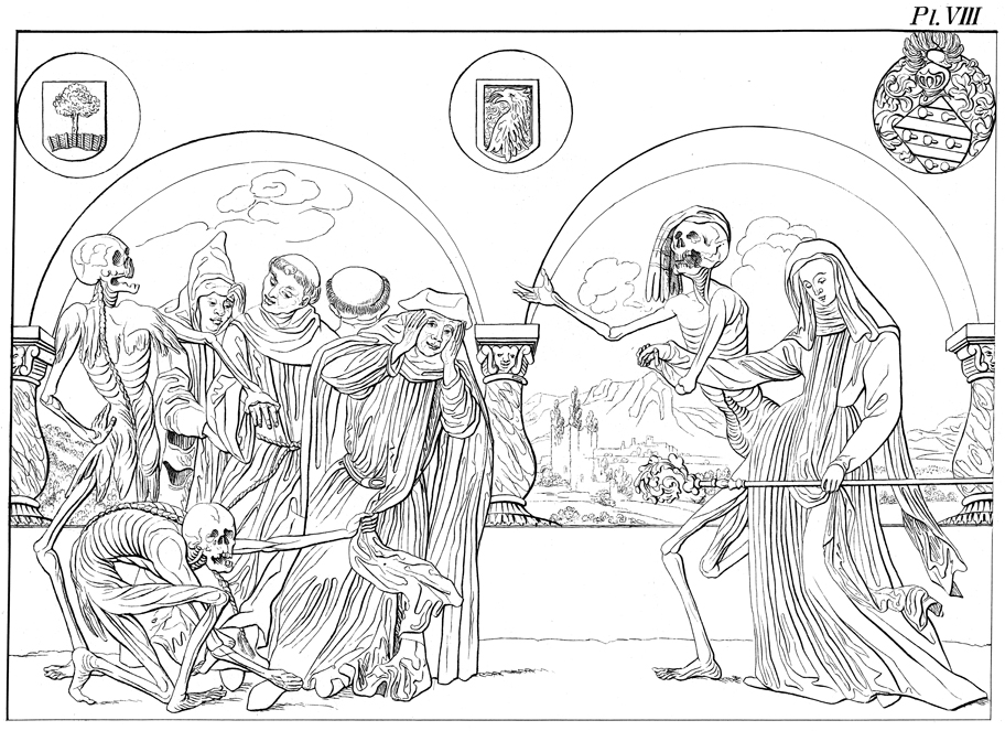 Description: On the left, Death takes the hand of a friar. Another skeleton grabs a nun's sleeve and foot to trip her uo, while another nun and monk are untouched. On the right, Death leads an abbess who holds a crozier. Original image by Niklaus Manuel Deutsch (1484-1530), copied by Guillaume Stettler and lithographed by Wilhelm Stettler.