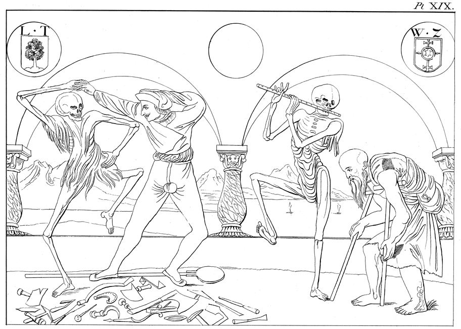 Description: ON the left, Death dances with a carpenter. On the right, Death plays a reed flute for a beggar hunched in his crutches. Original image by Niklaus Manuel Deutsch (1484-1530), copied by Guillaume Stettler and lithographed by Wilhelm Stettler.