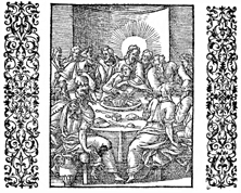 Description: Jesus eats the Passover meal with his disciples. The beloved disciple reclines in Jesus' bosom. Judas Iscariot is depicted with horns holding a moneybag.