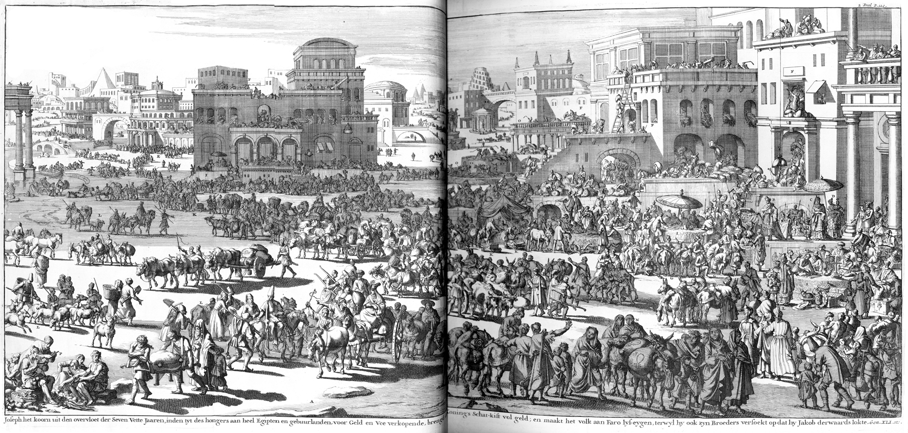 Description: People of surrounding lands, including Joseph’s brothers, gather in Egypt during a famine to buy grain from Pharaoh’s stockpiles.