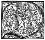 Description: This initial letter D depicts the Jesus riding a donkey as he enters Jerusalem to the waving of palm branches.