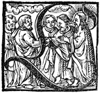 Description: This initial letter E depicts Jesus Christ telling his disciples parables.
