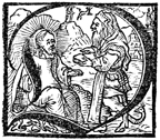 Description: This initial letter D depicts Satan tempting Jesus. Satan challenges Jesus to turn a stone into bread (foreground) and suggests he throw himself off the roof of the temple because the angels will save him (back left).