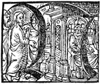 Description: This initial letter N depicts Jesus instructing his disciples to pray in secret.