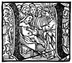 Description: This initial letter U depicts Jesus raising a widow’s son from the dead at Nain.