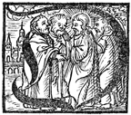 Description: This initial letter D depicts Jesus teaching his disciples and blessing Peter after Peter declares him the Messiah.