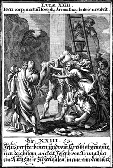 Description: Jesus' body is removed from the cross by Joseph of Arimathea.