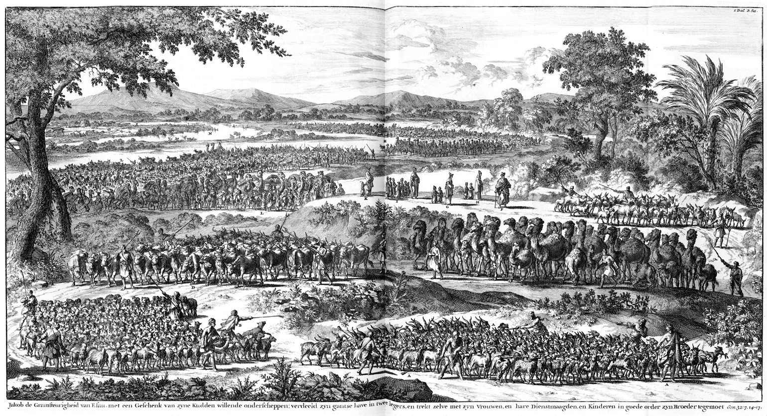 Description: Jacob goes to meet Esau, bringing gifts of flocks and herds.