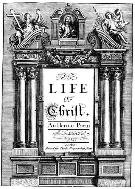 Description: This architectural bolder depicts columns on the left and right. On the top of the page is an image of Jesus with a globus cruciger, flanked by two angels, one with a cross and nails, the other with a spear and a crown of thorns.