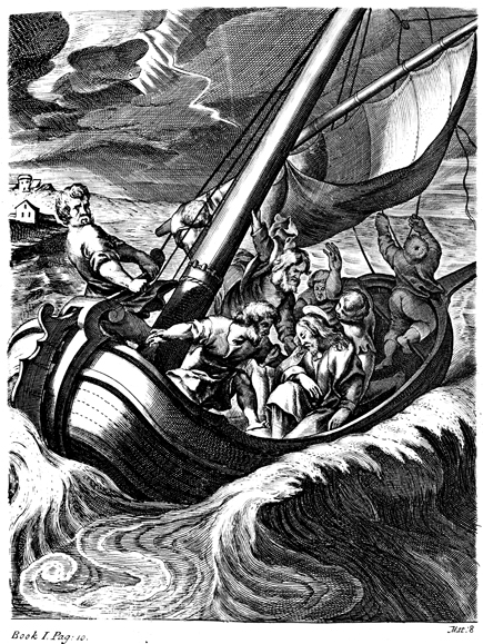 Description: Jesus sleeps in the boat while a storm threatens to sink it. The Apostles, frightened, awake Jesus, who stills the storm.