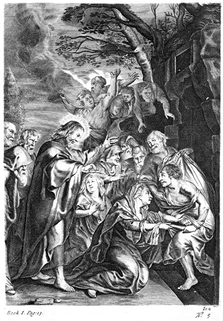Description: As a crowd watches in amazement, Jesus raises Lazarus, now dead four days. Mary and Martha are kneeling as Lazarus emerges from the tomb.