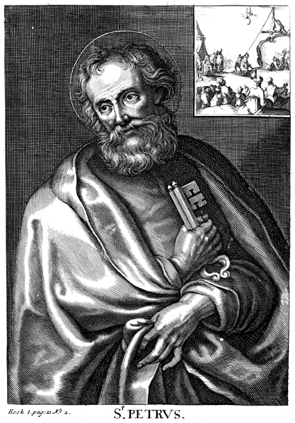 Description: A portrait of Saint Peter holding his attribute, a key. In the upper right-hand corner is a scene depicting Peter’s upside-down crucifixion.