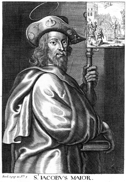 Description: A portrait of James the greater, one of the twelve apostles. James is shown wearing a traveler’s hat with scallops on it, both of which are his attributes. In the upper right-hand corner is a scene depicting his beheading.