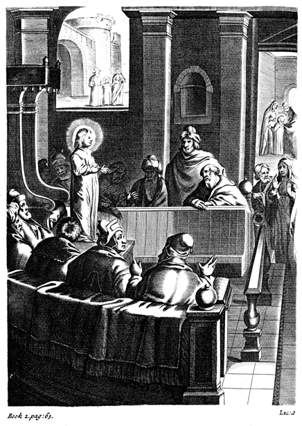 Description: Mary and Joseph find the twelve-year-old Jesus in the temple among the teachers, listening and asking questions. Two additional scenes of Jesus with Mary and Joseph appear in the background.