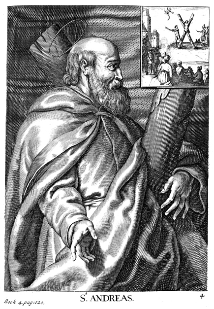 Description: A portrait of Saint Andrew, one of the twelve apostles, leaning against a diagonal cross known as a Saltire or Saint Andrew’s cross. In the upper right-hand corner is a scene depicting Andrew’s crucifixion on a saltire.