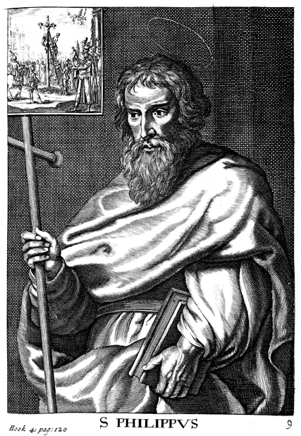 Description: A portrait of Philip, one of the twelve apostles, holding a cross, his attribute. In the upper left-hand corner is a scene depicting Philip’s martyrdom on a cross.