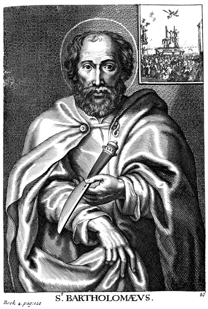 Description: A portrait of Bartholomew, one of the twelve apostles, holding a knife, the instrument of his martyrdom. In the upper right-hand corner is a scene of Bartholomew’s martyrdom, where his skin was flayed from his body.