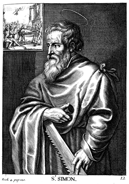 Description: A portrait of Simon, one of the twelve apostles, holding a saw, the likely instrument of his martyrdom. In the upper left-hand corner is a scene of Simon’s martyrdom in which some traditions say he was sawn in two.