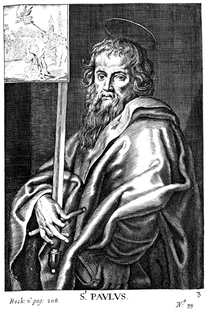 Description: A portrait of the Apostle Paul holding a sword, the instrument of his martyrdom. In the upper left-hand corner is a scene depicting the beheading of Paul in Rome.
