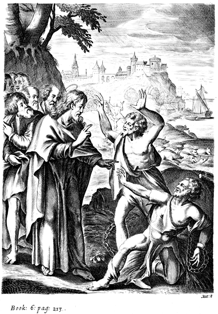Description: Jesus heals the demon-possessed by casting out their demons and sending them into a herd of swine.