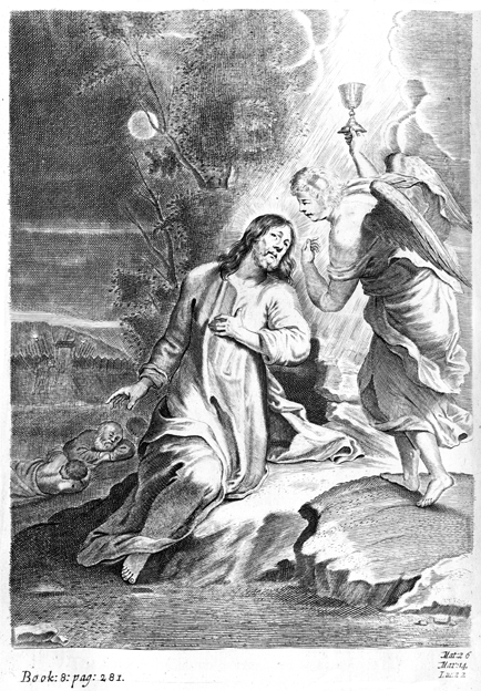 Description: Jesus prays in the Garden of Gethsemane and an angel ministers to him while the disciples sleep.