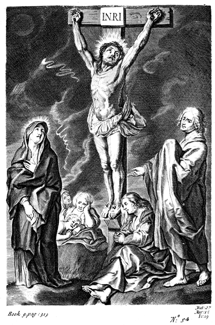 Description: Jesus is crucified as his mother Mary, Mary the wife of Clopas, Mary Magdalene, and John, the disciple whom he loved, watch. The INRI at the top of the cross stands for “Jesus of Nazareth, King of the Jews”.