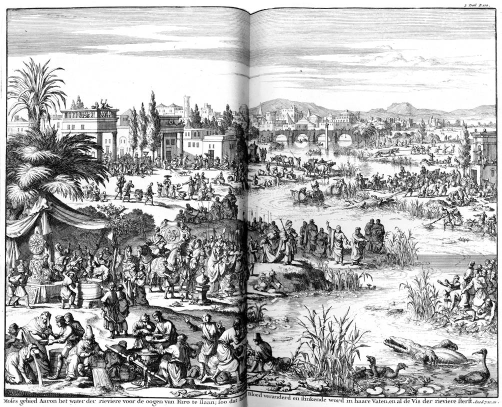 Description: God punishes Egypt with the first plague, and the Nile River turns to blood.