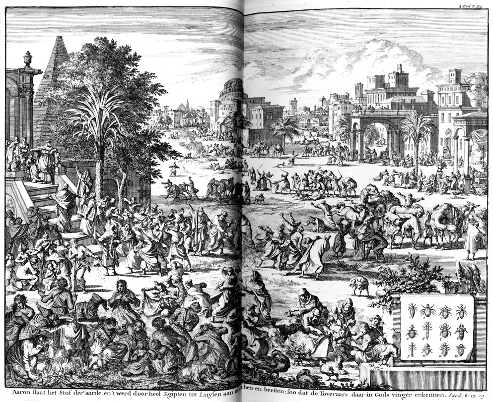 Description: God punishes Egypt with the third plague, an infestation of gnats. The image includes a diagram of insects (lower right).