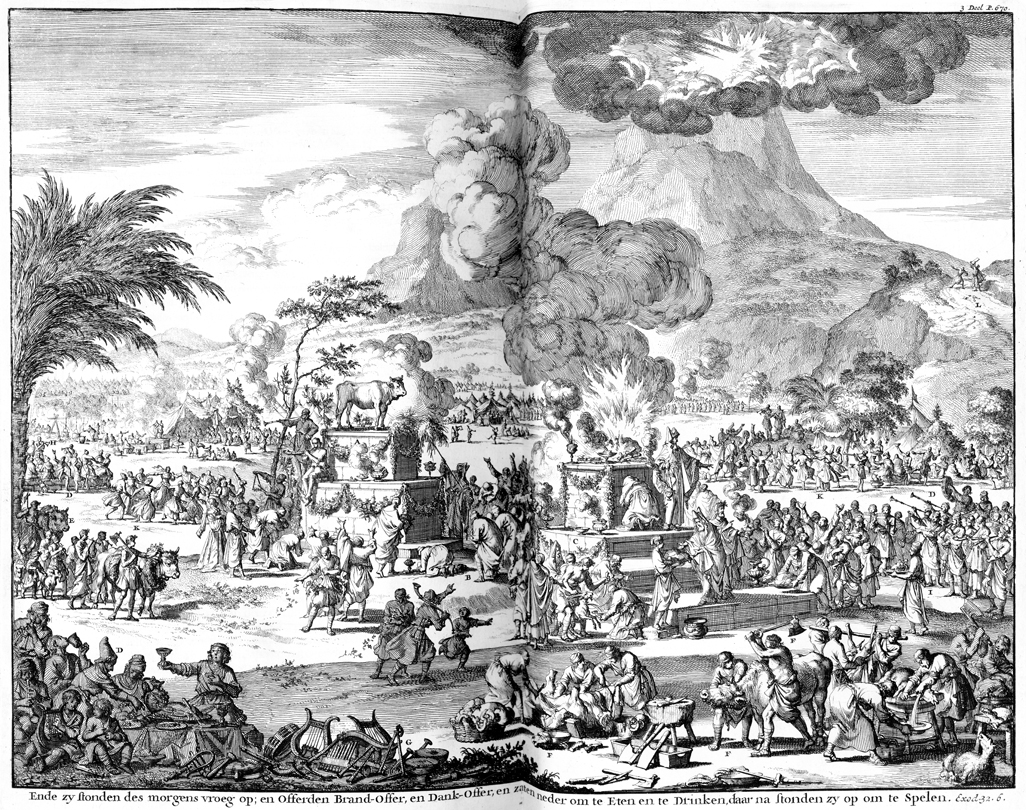 Description: The Israelites worship the golden calf at the base of Mount Sinai.