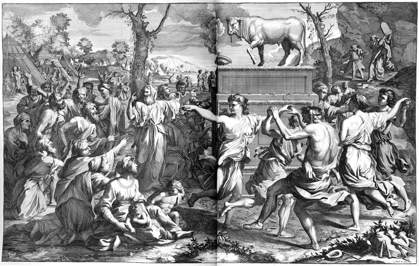 Description: Moses sees the Israelites worshipping the golden calf at the base of Mount Sinai, and in anger he prepares the stone tablets to throw them down (top right).