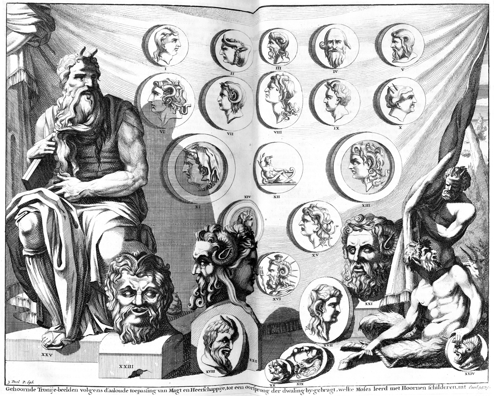 Description: A depiction of Moses with horns, based on a Vulgate mistranslation. Moses here is depicted alongside other mythological figures with horns, such as Jupiter and Ammon.