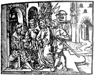 Description: Jesus is tried before Pontius Pilate as Judas Iscariot hangs himself in the background.