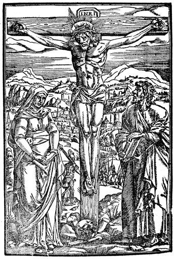Description: Mary and John stand on each side as Jesus hangs from the cross.