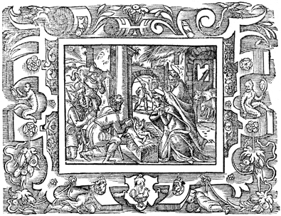 Description: The shepherds come to worship the baby Jesus in Bethlehem (front) after learning of his birth from the angel in the pasture (rear). This story is from Luke 2, though the book in which it appears cites Matthew 2.