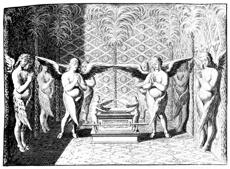 Description: This illustration of the inner sanctuary of the tabernacle, called the Holy of Holies depicts the Ark of the Covenant surrounded by statues of angels.