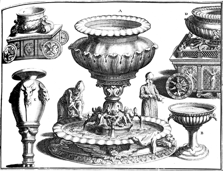 Description: Depictions of what the basin for the tabernacle may have looked like. Priests are shown purifying themselves (center).