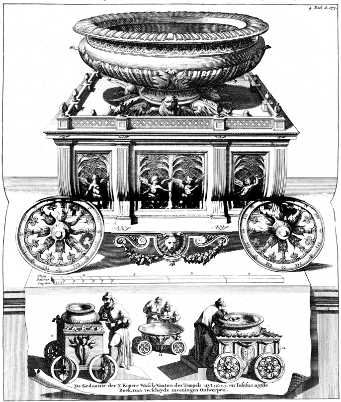 Description: Depictions of what the basin for King Solomon’s temple may have looked like. Priests are shown purifying themselves (bottom).