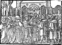 Description: A rendering of a wedding ceremony; the Holy Spirit appears overhead in the form of a dove.