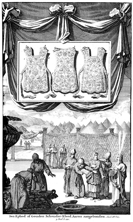 Description: A depiction of priestly ephod, a linen garment in ancient Israelite culture(top). Aaron and his sons put on their ephods as Moses observes (below).