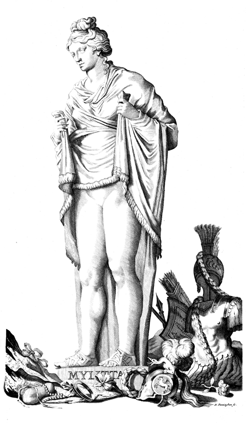 Description: Mylitta, the Babylonian goddess of love and fertility and war, associated with goddesses such as the Phoenician Astarte, the Sumerian Inanna, and the Assyrian Ishtar. Engraved by D. Penninghen.