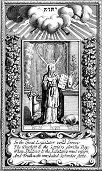 Description: Moses with veil over his face holds the tablets of the Ten Commandments while standing among ritual objects in the tent of meeting beneath an image of God as the divine name.